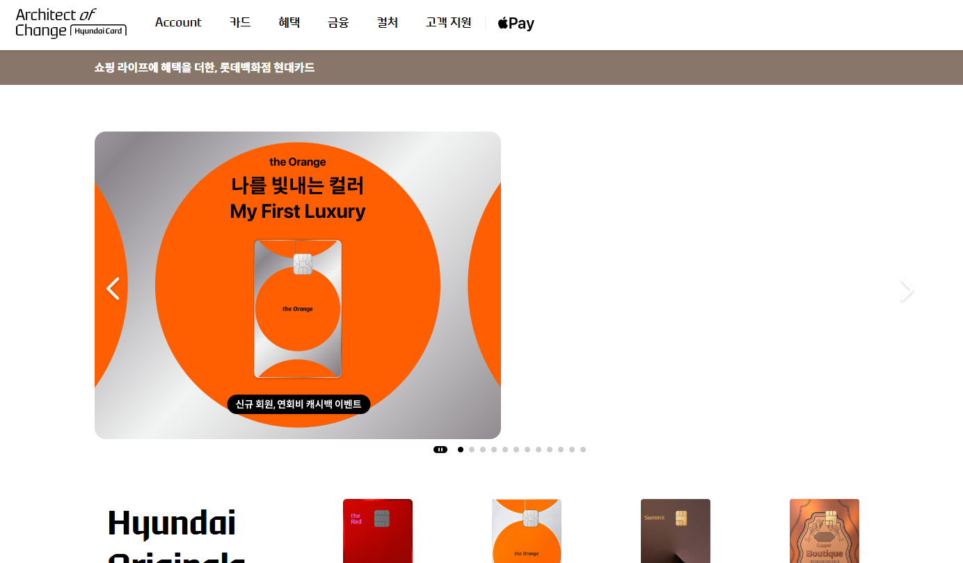 홈페이지 상단 내비게이션에는 카드안내/신청, 이용내역, 혜택·이벤트, 금융서비스, 고객지원 메뉴가 배치돼 있습니다. 첫 화면 중앙에는 최신 카드 상품 소개와 진행 중인 혜택 배너가 노출됩니다.