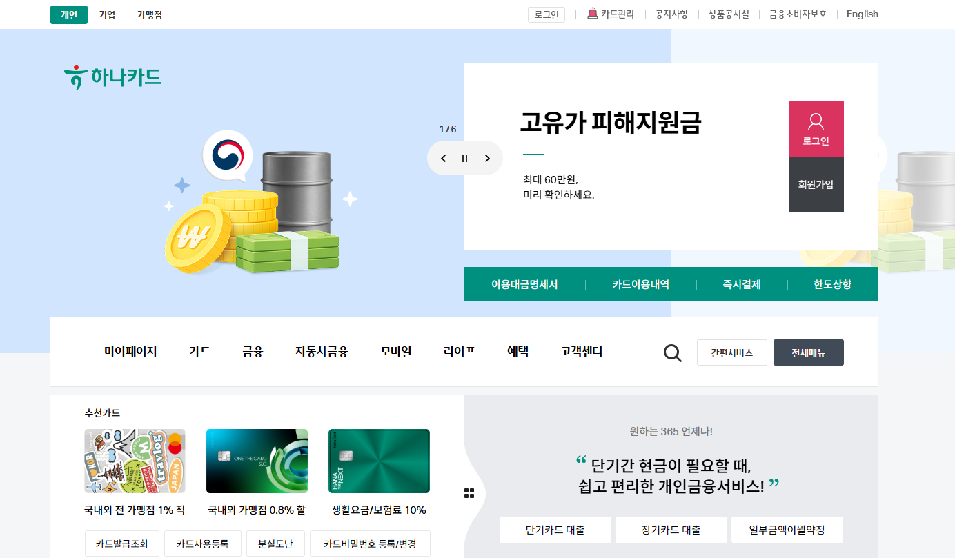 - 검색창에 '하나카드' 입력 후 공식 홈페이지 접속